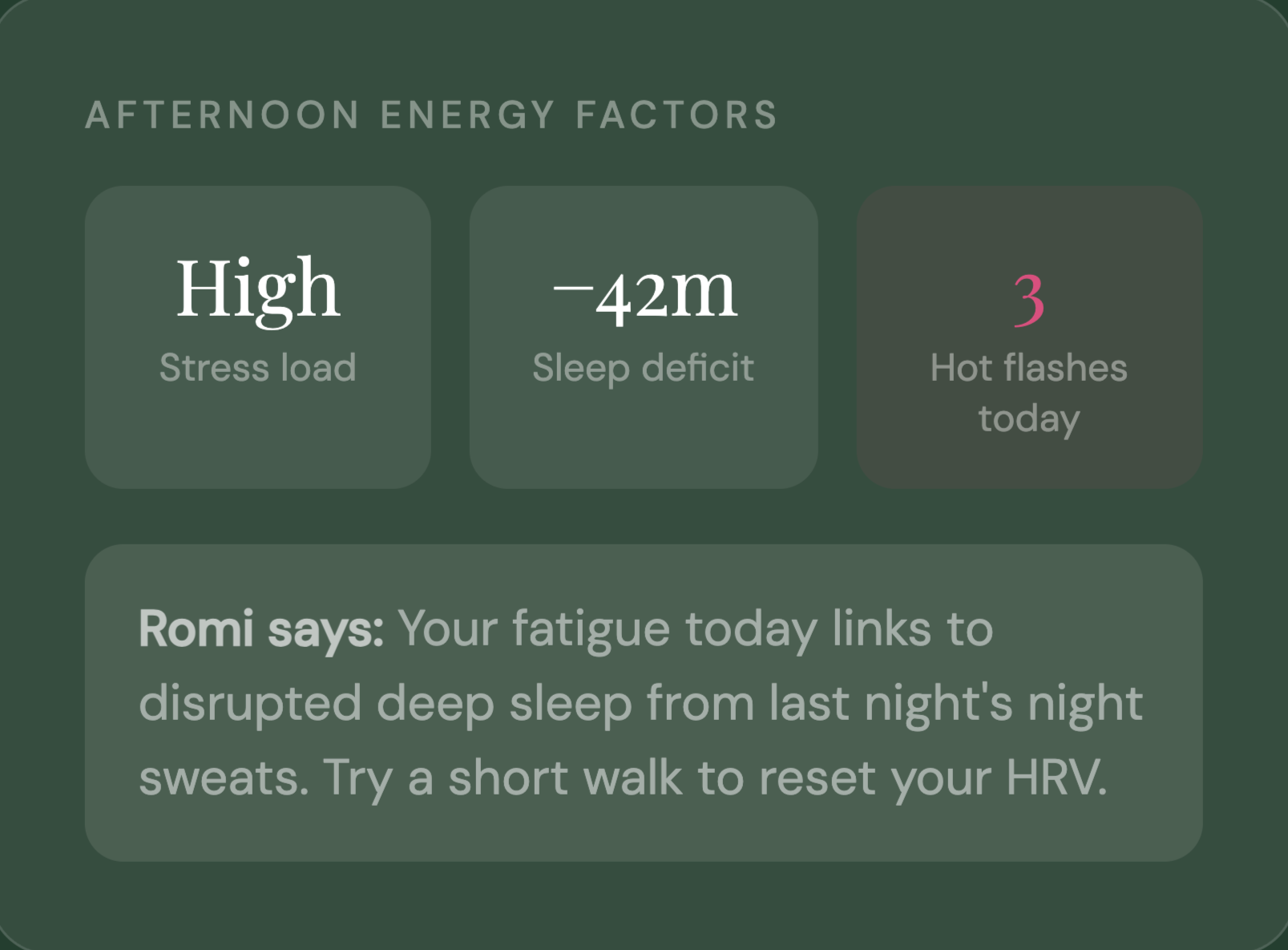 Brain fog, fatigue, and mood changes are among the most common—and most dismissed—menopause symptoms. Romi correlates your stress signals, sleep debt, and hot flash activity so you finally understand what's driving them.