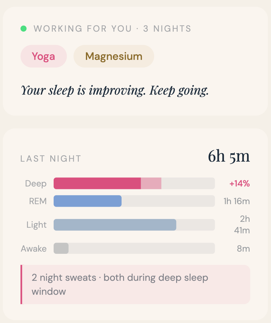 Night sweats and disrupted sleep are nearly impossible to track on your own. Romi monitors wrist temperature for thermal shifts that precede night sweats and maps your sleep stages to show exactly when—and why—your sleep is interrupted.