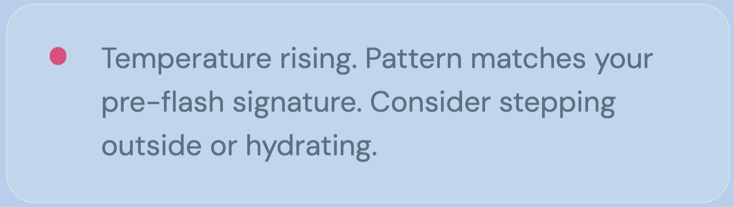 Romi learns your personal pre-symptom signature by tracking wrist temperature, heart rate, and stress signals, so you get a heads-up before hot flashes strike.
